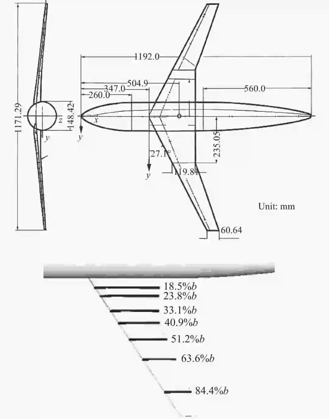 图1:DLR-F4标模几何尺寸和机翼展向典型截面位置