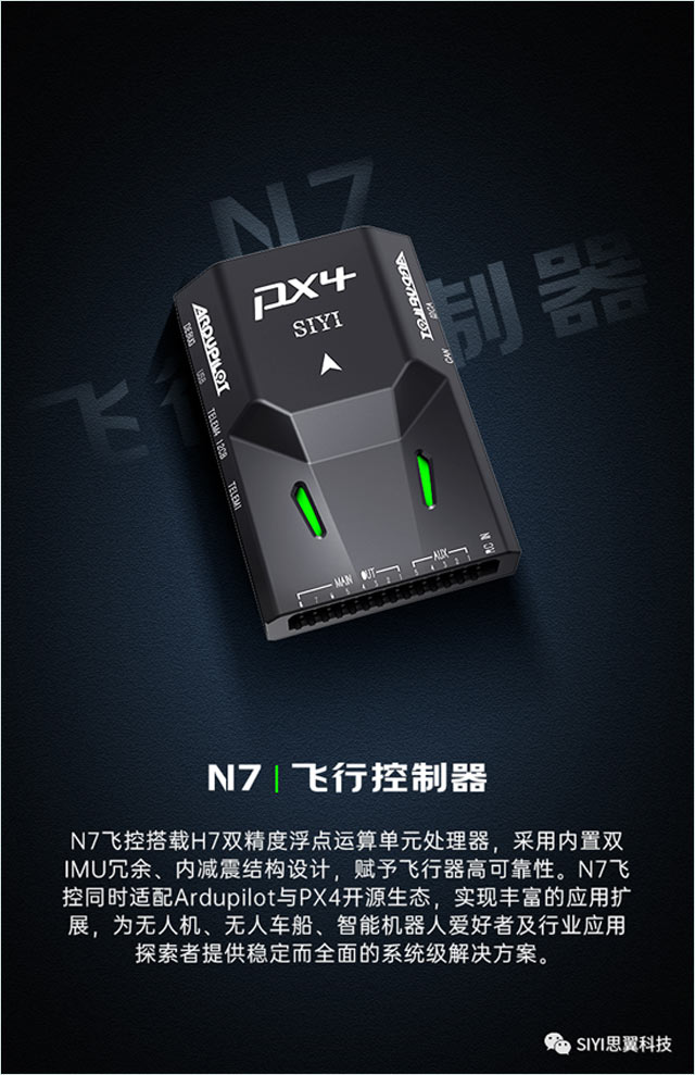 N7飞行控制系统支持配套一系列功能丰富的思翼产品以及开源生态产品,能轻松满足不同应用需求。结合使用PX4、ArduPilot、QGroundControl、Mission Planner在内的高性能固件与软件,N7飞行控制器能支持更广泛的应用场景,为使用者提供强大的系统级解决方案。
