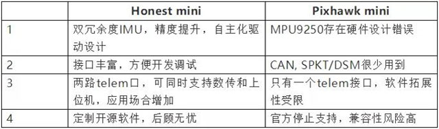 Honest mini产品定位在低成本飞控领域,并支持很强的软件拓展能力,可适用于多旋翼、固定翼、复合式无人机、小型扑翼飞机等机型。相比市场上类似产品而言,我们除了提供硬件产品之外,还提供强大的软件支持能力。我们的硬件采用了多冗余度IMU设计,与官方pixhawk mini产品相比,优势汇总如下。据行业不完全统计,国内这类飞控的单品市场每年在4000万以上。