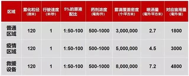 但当务之急,R80农业无人车的任务就是与极飞农业无人机空地配合,对疫情进行防控消杀。目前,城市街道、社区、农村喷洒的消毒剂主要是84消毒液(一般有效的氯浓度为4%-7%)。在R80无人车正式上岗前,极飞防疫专项组根据过去与中国疾控中心、拜耳环境科学等合作机构开展的防控试验成果,及此前参与的抗震救灾消杀经验和各地防疫效果,为R80配备了比常规消毒浓度更高的消毒液,让药液从无人车雾炮喷射出到落地的过程中,和空气里、地面上的水分继续稀释,持续杀菌,从而保障消杀防疫效果。药液配制方法和喷洒参数如下: